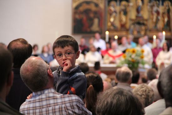 Statt einer Predigt haben die Gottesdienstbesucher ein Glaubensbekenntnis aus einzelnen Worten gebildet. "Meine Hoffnung und meine Freude, meine Stärke, mein Licht, Christus meine Zuversicht, auf Dich vertrau ich und fürcht mich nicht." - so lautete dann nicht nur der Satz, der auf den Treppenstufen des Chorraums dargestellt wurde, so sangen es dann die Gemeindemitglieder zusammen mit dem Kinder- und Kirchenchor, sowie der Jungen Kantorei.
