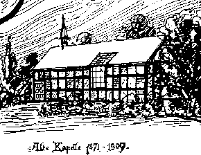 In diesem Haus Gelnhäuser Straße 39 fand der erste kath. Gottesdienst nach der Reformation statt (Foto etwa aus dem Jahre 1902) und Lageskizze des Kämpfschen Hauses