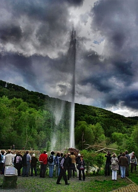 Mit einem Schiff fuhr die Reisegesellschaft zu einer Halbinsel im Rhein, um den größten Kaltwassergeysir der Welt - der über 60 m in die Höhe springt - zu bewundern. Andernach liegt im Weinbaugebiet des Mittelrheins. Da lag es auf der Hand, dass die fröhliche Schlussrast in einem Weinhaus stattfinden musste.